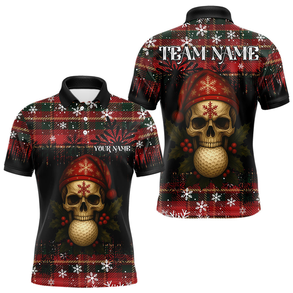 Maxcorners Black and Red Plaid Christmas pattern Skull Mens Polo Shirt Custom Golf outfit For Men, golfing gifts LM1411