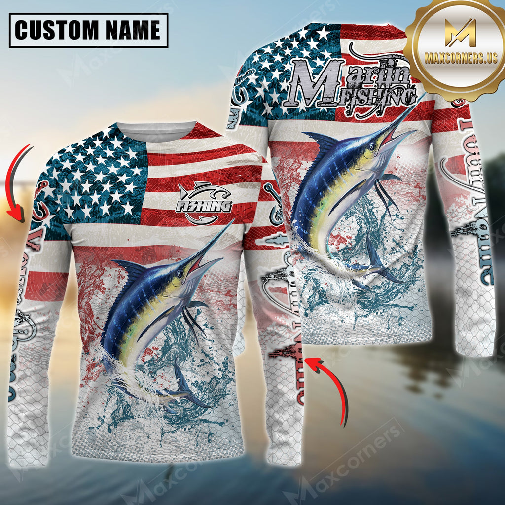 Maxcorners Marlin Fishing American Flag Splash Design Personalized Name, Team Name 3D Long Sleeve Shirt