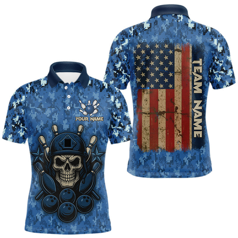 Maxcorners Blue Camo American Flag Veteran Skull Bowling Shirts For Men Custom patriotic Bowling Team Jerseys MT0811