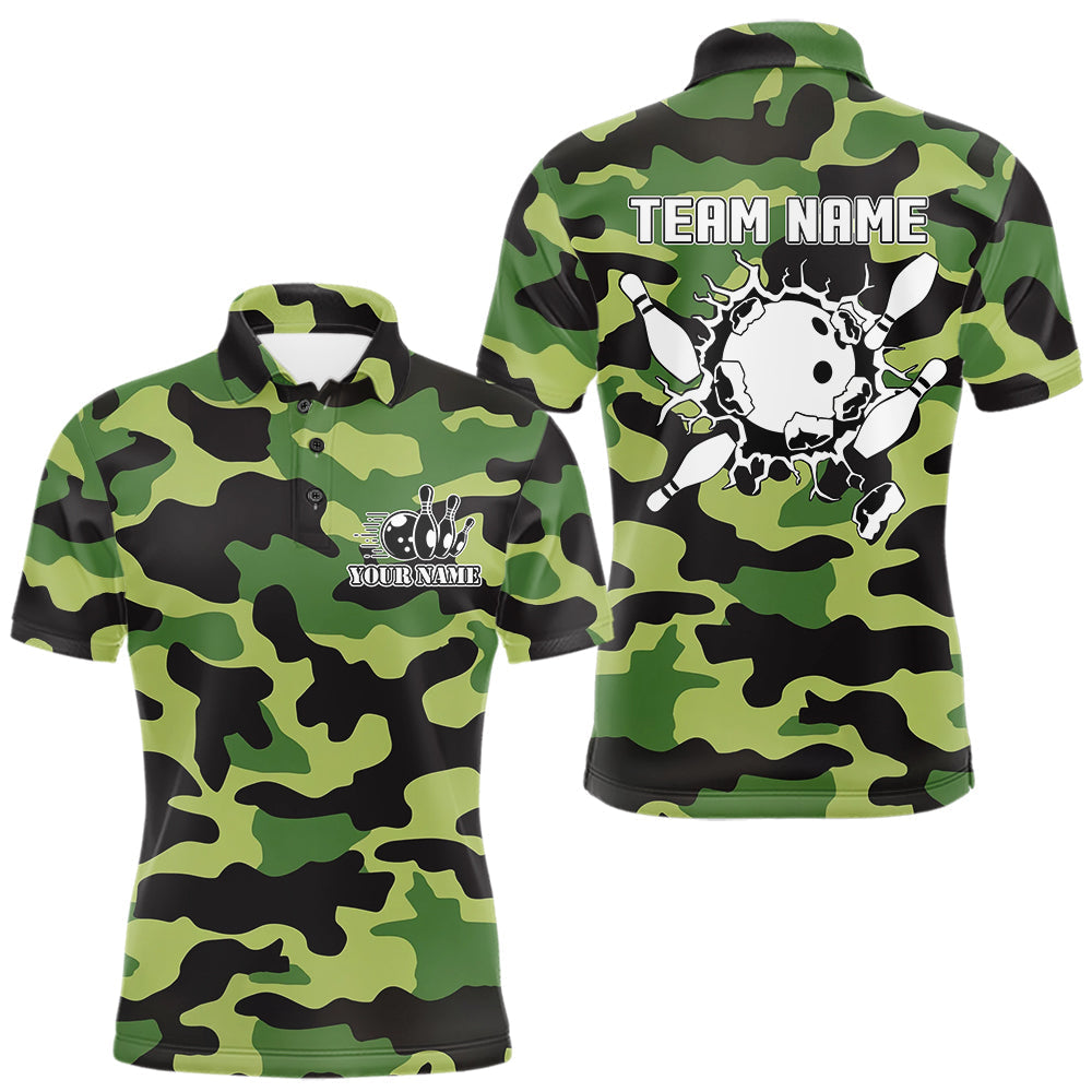 Maxcorners Bowling Polo, Quarter Zip shirts For Men Custom bowling ball and pins Green camo Bowling Team Jersey LM1610