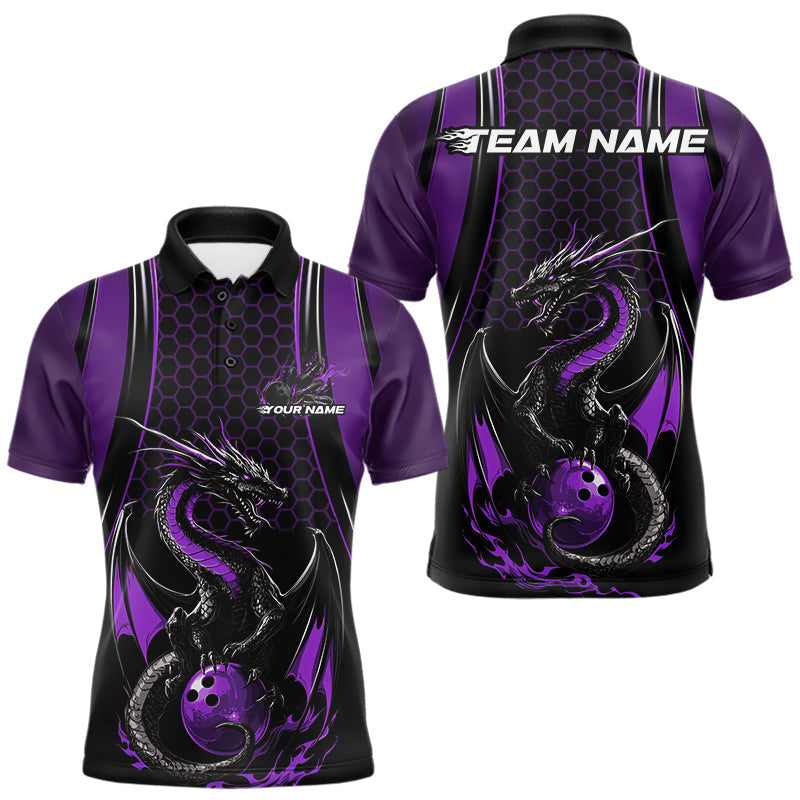 Maxcorners Custom Black And Purple Flame Dragon Bowling Jerseys, Dragon Bowling Team Men Polo Shirt MT2009