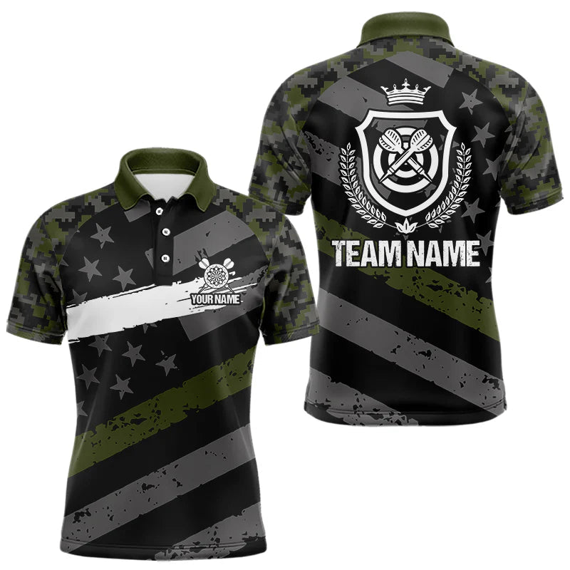 Maxcorners Green Military Camo US Flag Darts Jersey For Men Custom Grunge Darts Shirt Team Polo & Quarter Zip LM1610