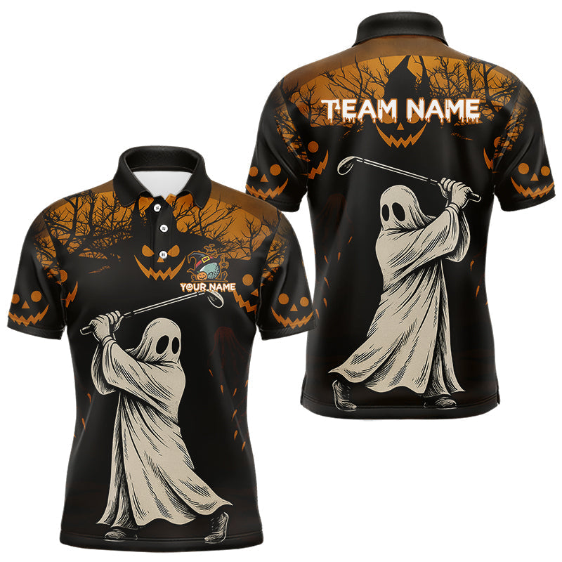 Maxcorners Funny black and orange Ghost Golfer Halloween Golf Polo Shirt For Men Custom golf attire for men MT2709