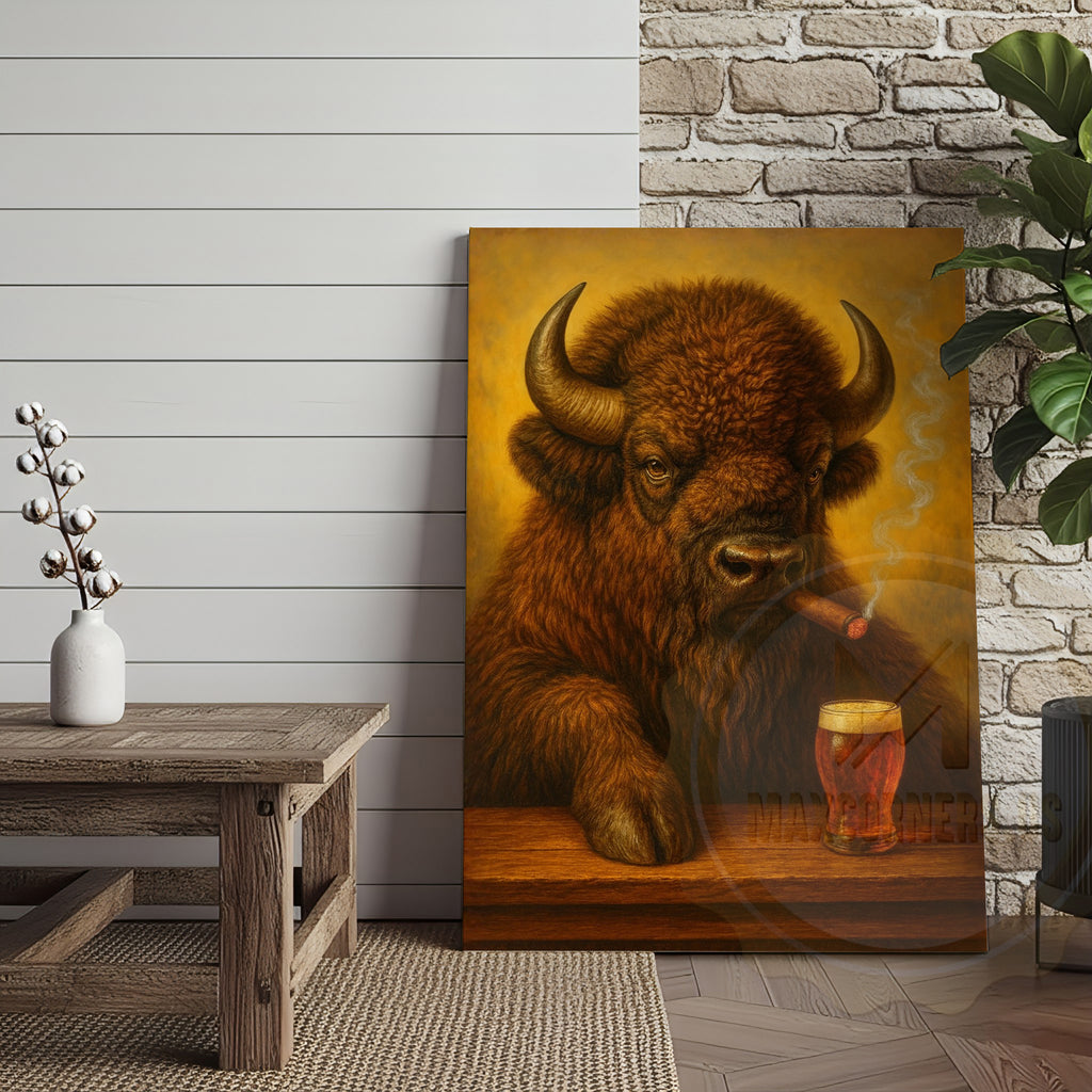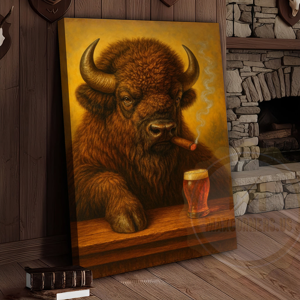 Maxcorners Buffalo Smoking Cigar with Beer Rustic Tavern Art Wrapped Canvas