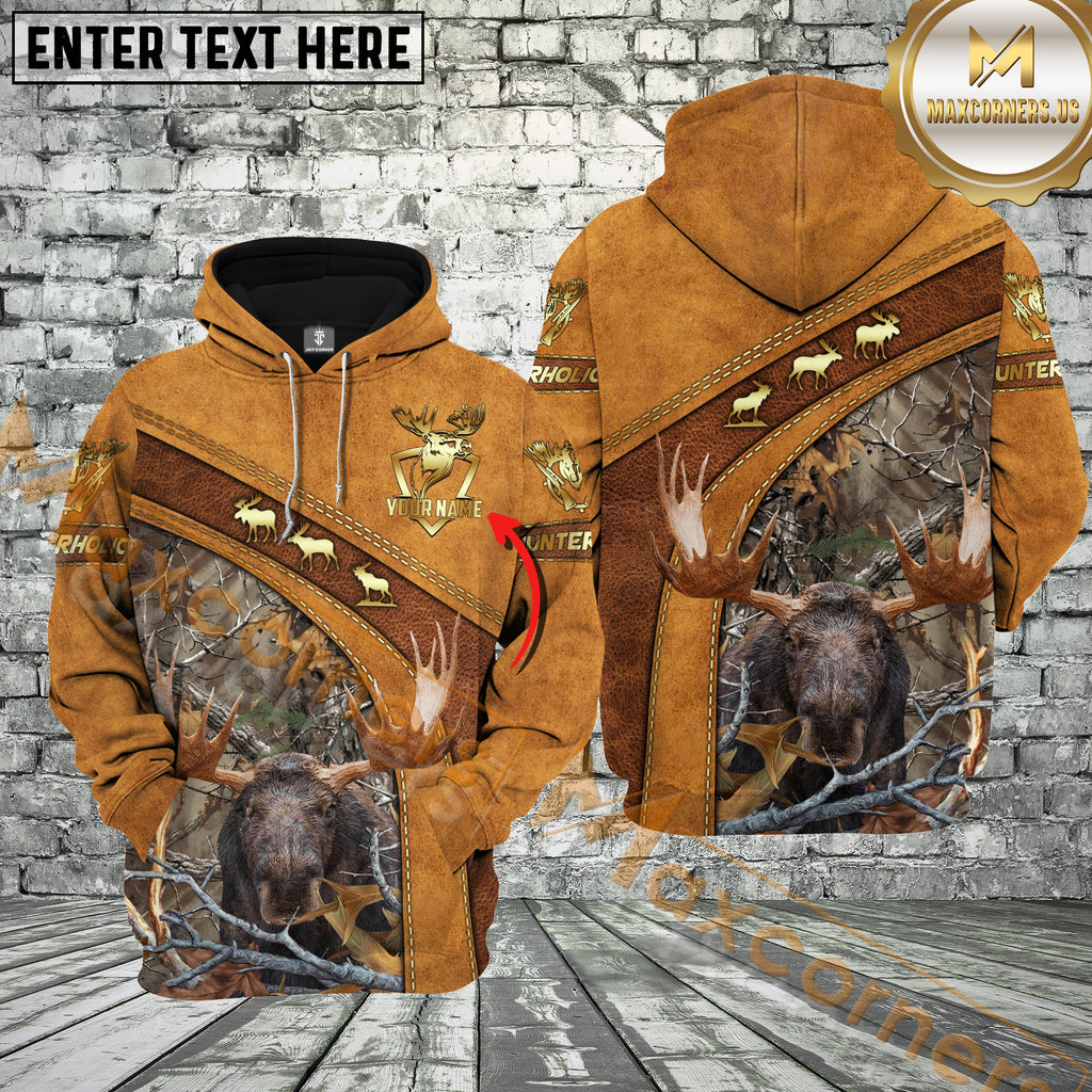Maxcorners Brown Leather Style Moose Hunting Custom Name Hunter Apparel With Brown Camo 3D Hoodie All Over Printed Clothes