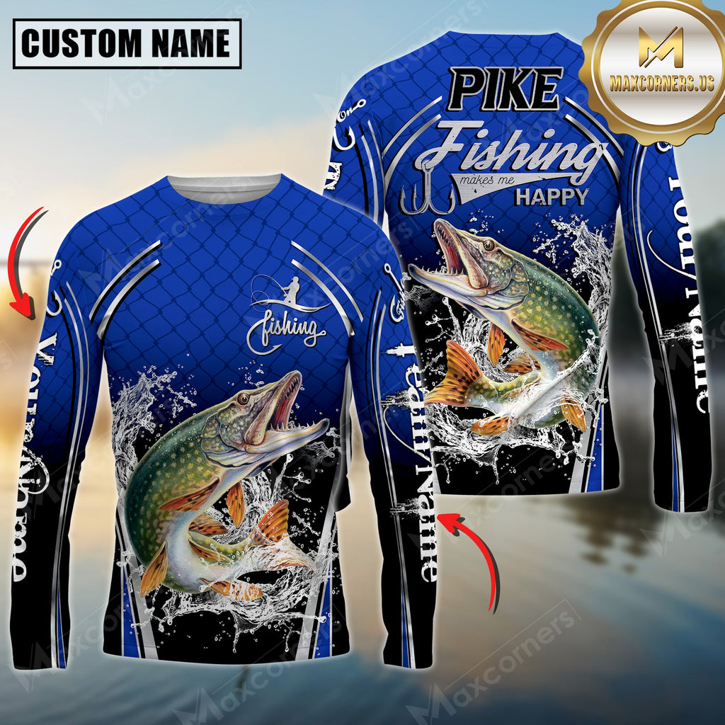 Maxcorners Silver Pike Fishing Makes Me Happy Splashing Water Personalized Name, Team Name 3D Long Sleeve Shirt