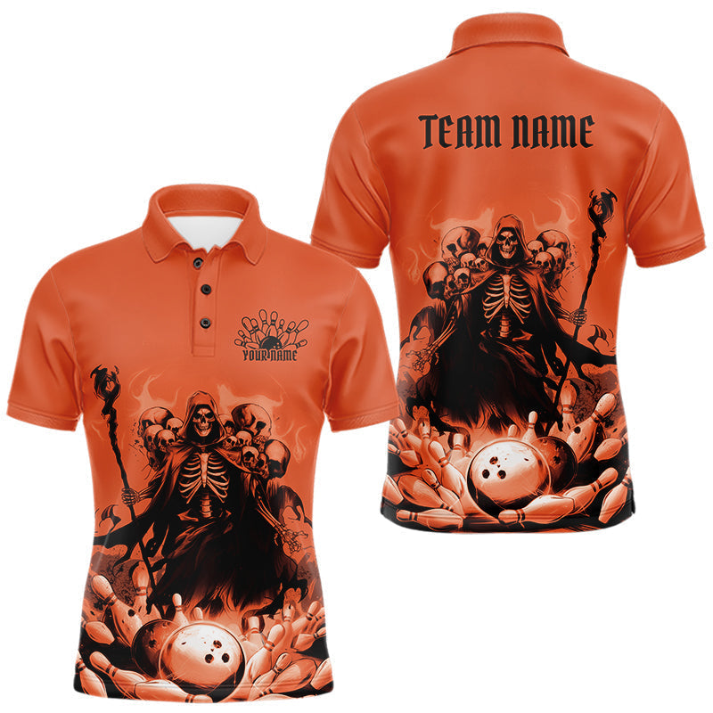 Maxcorners Custom Orange Flame Grim Reaper Bowling Men Polo Shirts, Piles Of Skull Halloween Outfit MT2009