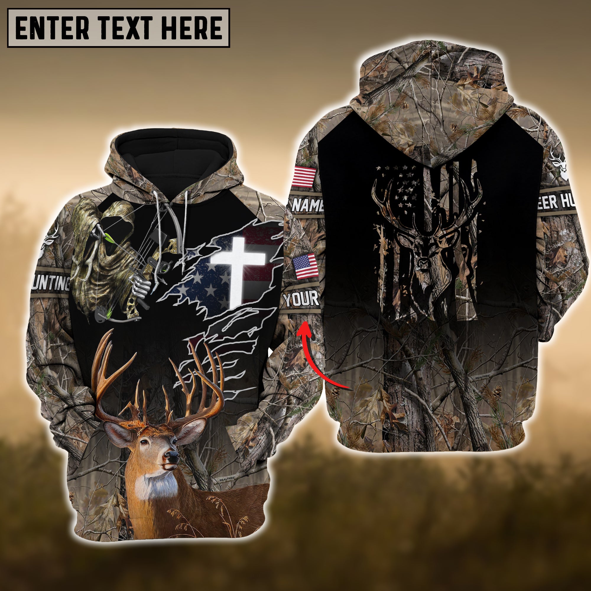 Maxcorners Brown Deer Hunting USA Flag Cross With Reaper Bow Custom Name Shirt 3D All Over Printed Clothes