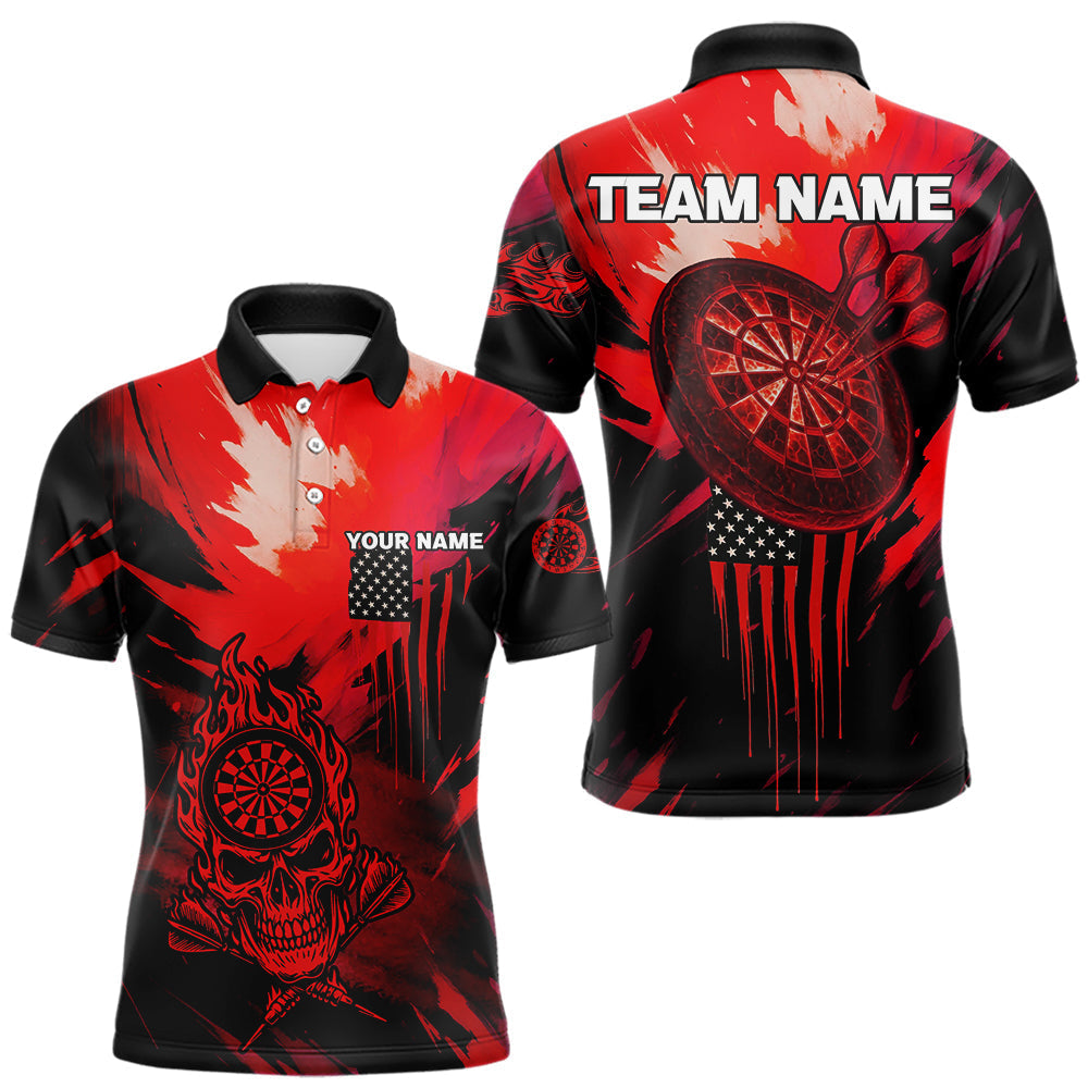 Maxcorners Custom Red Grunge Skull Dartboard Patriotic Dart Men Polo Jerseys US Flag Dart Shirt MT1810