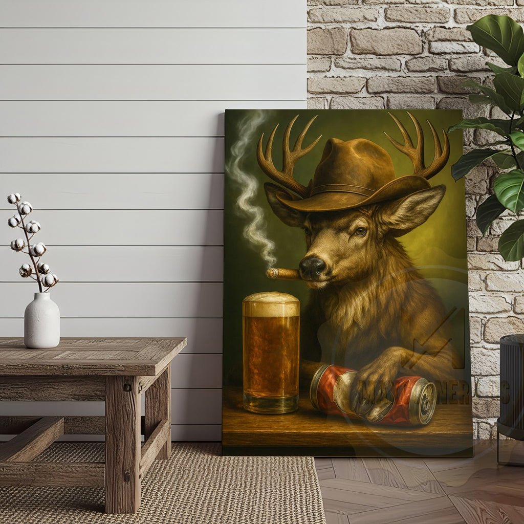 Maxcorners Deer Cowboy With Beer And Cigar Rustic Bar Wall Art Wrapped Canvas