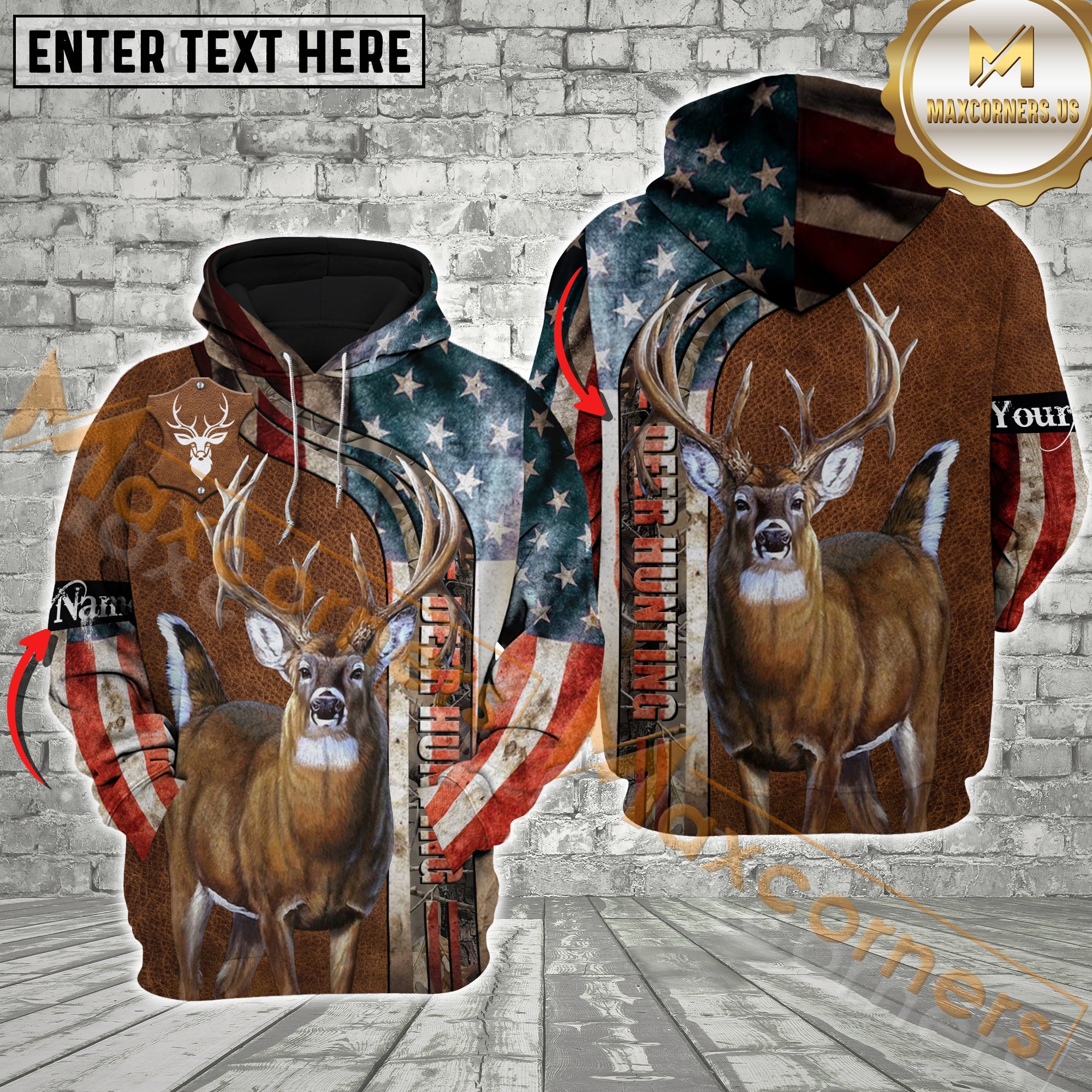 Maxcorners Deer Hunting USA Flag Brown Leather Pattern Custom Name Shirt 3D All Over Printed Clothes