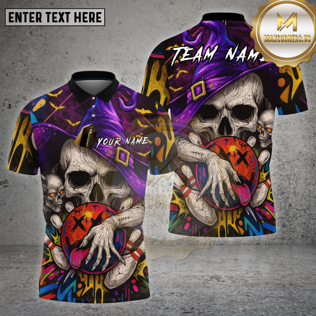 Maxcorners Halloween Skull Wizard Bowling Shirt Neon Graffiti Ball Spooky Team Custom Name Personalized Jersey (4 Colors)
