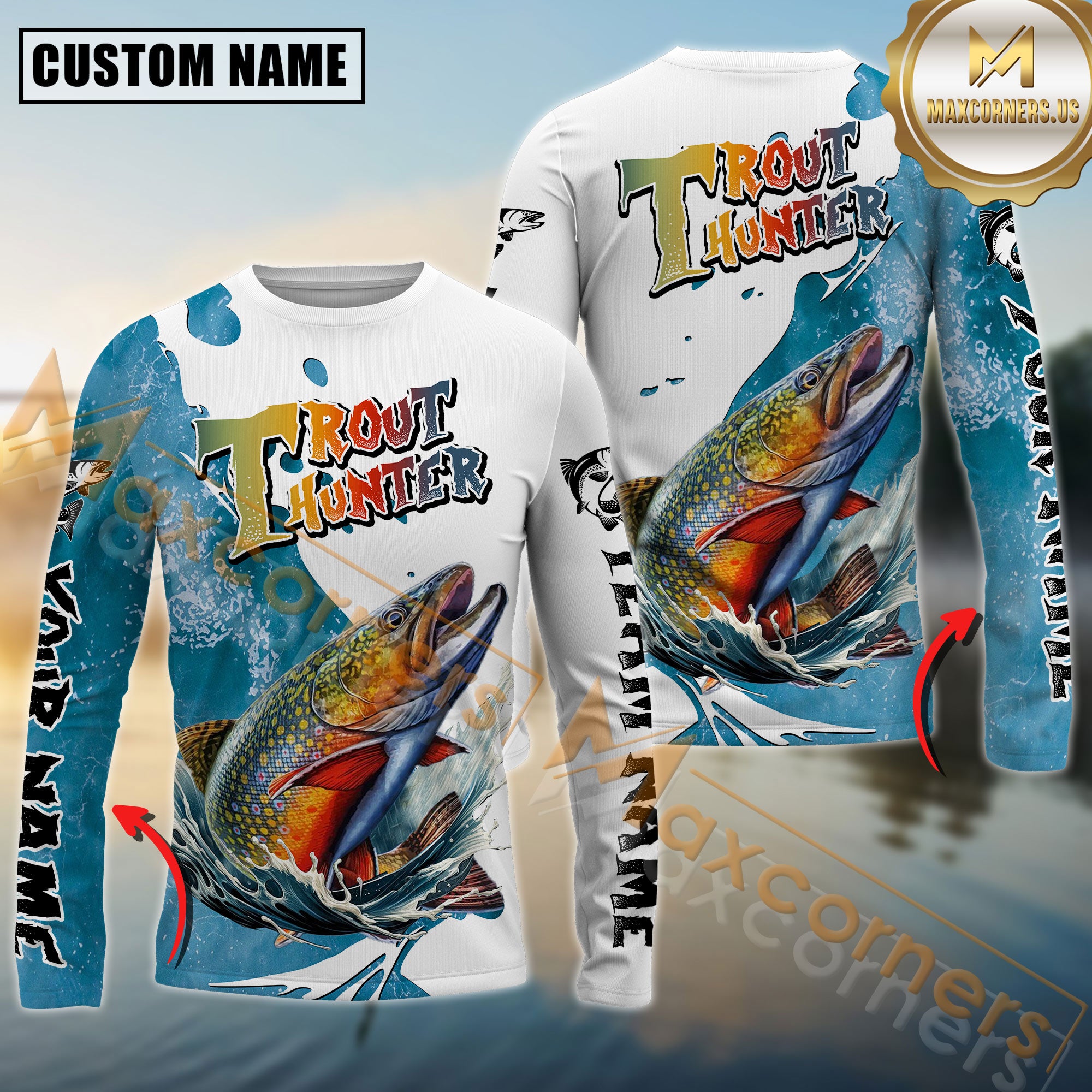 Maxcorners Trout Hunter Fishing Graphic Splash Effect Personalized Name, Team Name Long Sleeve Shirt